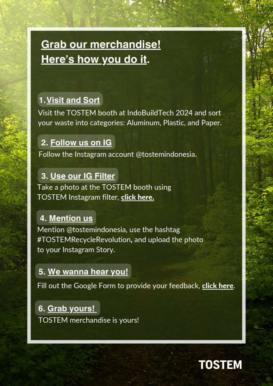 4. Mention us Mention @tostemindonesia, use the hashtag #TOSTEMRecycleRevolution, and upload the photo to your Instagram Story.